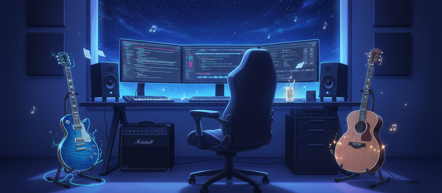 The song reflects many late nights similar to those described in the lyrics, though not always focused on music itself. Glowing screens, AI-assisted coding, guitars resting in the room, and getting through the night with a can of Monster. It’s less a narrative than a snapshot: a brief record of learning and quiet focus.